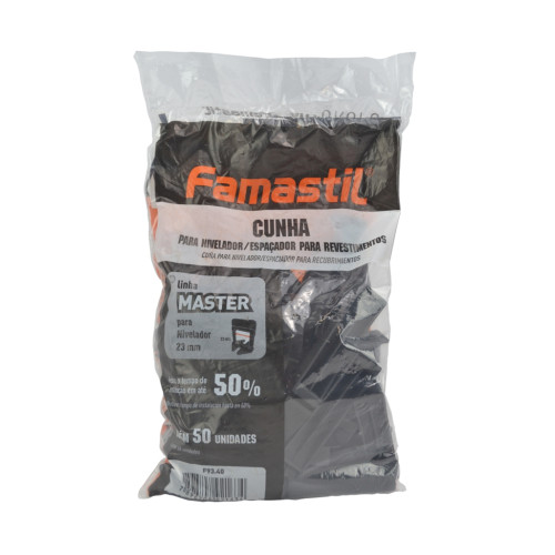 Cunha para Nivelador de Revestimento Famastil é um componente do sistema de nivelamento de pisos e revestimentos, fabricado pela Famastil, marca do Grupo Foxlux. Ela é usada em conjunto com clipes espaçadores e um alicate nivelador para garantir o alinhamento e nivelamento preciso de cerâmicas, porcelanatos, pedras naturais ou outros revestimentos durante a instalação, resultando em juntas uniformes e acabamento profissional.